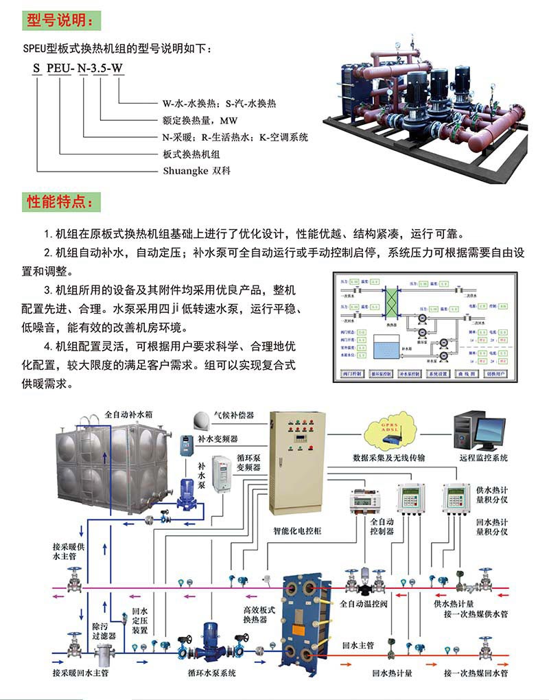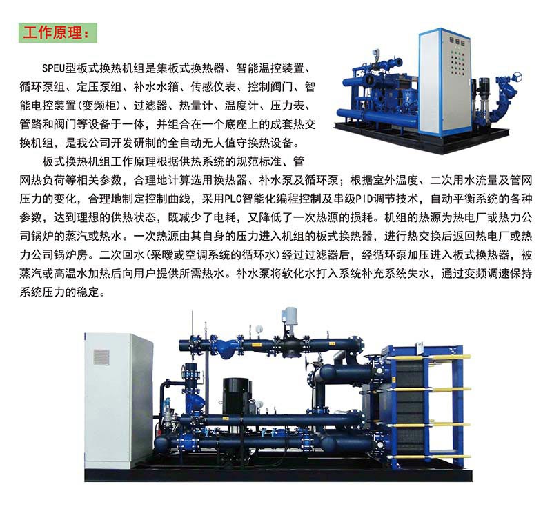SPEU型板式換熱機(jī)組是我公司根據(jù)我國供熱行業(yè)發(fā)展趨勢(shì),專門針對(duì)供暖區(qū)域來設(shè)計(jì)開發(fā)的有效型換熱機(jī)組,是集城市供熱技術(shù)、智能化控制技術(shù)與人性化結(jié)構(gòu)設(shè)計(jì)于一體的智能型熱交換機(jī)組,具有強(qiáng)大的功能來完成所有建筑物的各種區(qū)域熱能需求??蓮V泛適用于工廠、機(jī)關(guān)、學(xué)校、住宅小區(qū)、別墅等民用建筑;商場、賓館、飯店、度假村等商用建筑的采暖、空調(diào)、洗浴用水、生活用水、游泳池冬日用水。